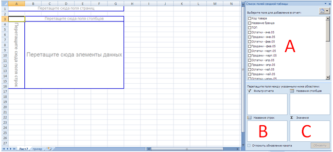 Перетащите из окна «Выберите поле для добавление в отчёт» (сектор A) «ТОП» в левый нижний угол шаблона (сектор В), «Название бренда» и «Остатки – апр.06, шт.» в правый нижний угол шаблона (сектор С).