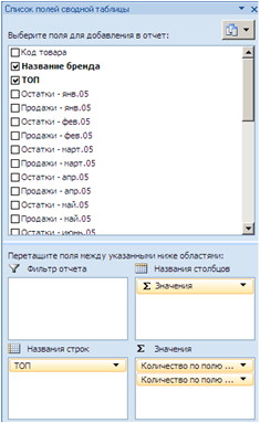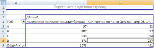 Как вы видите, MS Excel вывел в столбике A («ТОП»), все значения ТОП, которые встречаются в нашей первоначальной таблице. В столбике B и С, MS Excel вывел общее количество позиций, которое встречается в первоначальной таблице. В столбике В выведено общее количество позиций по каждому параметру ТОП (в данном случае мы использовали поле «Название бренда», так как знаем, что на протяжении всей таблицы оно было заполнено. Так как это текстовый формат ячеек, то MS Excel подсчитал их количество). В столбике С выведено количество позиций, которое имеется в наличии на дату анализа (в нашем случае на начало апреля 2006 года).