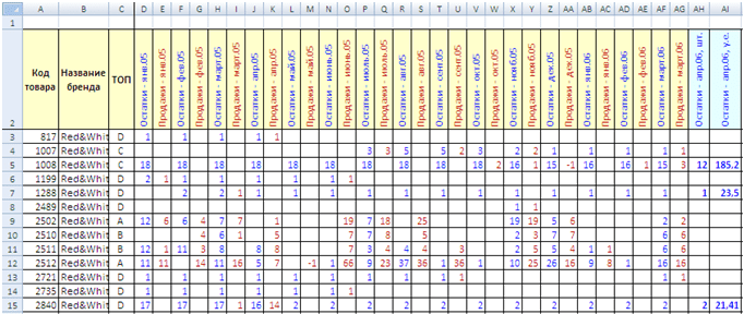 Таблица имеет следующие столбики: код товара, название бренда, ТОП, остатки на начало месяца в штуках, продажи за месяц в штуках (оригинал файла вы найдёте в внизу статьи).