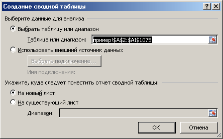 Нажмите на вкладку «Вставка» -> «Сводная таблица». Вы получите диалоговое окно: