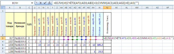 В основе формулы лежит функция ЕСЛИ, которая выводит в ячейку текущую себестоимость складских запасов, если позиция в течении последних трёх месяцев (ячейки AC3, AE3, AI3) не продавалась (в нашем случае сумма продаж равна нолю) и постоянно была в наличии.