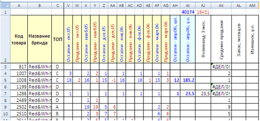 Протягиваем (копируем) формулу, написанную в ячейке AJ3 до конца таблицы. Таким образом мы для каждой позиции проводим расчёт по выявлению непродаваемости позиции.